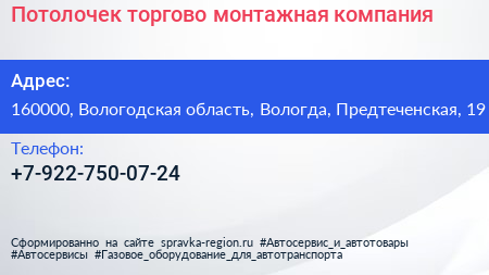 Потолочек, торгово-монтажная компания по адресу 160000, Вологодская область, Вологда, Предтеченская, 19 в дальнейшем Организация, размещена в следующих категориях: