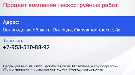 Процвет, компания пескоструйных работ по адресу Вологодская область, Вологда, Окружное шоссе, 8в в дальнейшем Организация, размещена в следующих категориях: