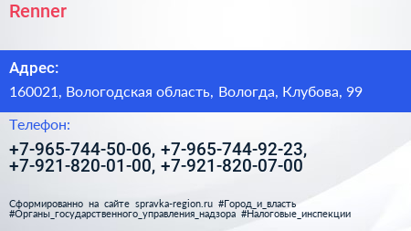 Renner по адресу 160021, Вологодская область, Вологда, Клубова, 99 в дальнейшем Организация, размещена в следующих категориях: