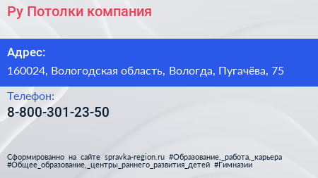 Ру Потолки, компания по адресу 160024, Вологодская область, Вологда, Пугачёва, 75 в дальнейшем Организация, размещена в следующих категориях: