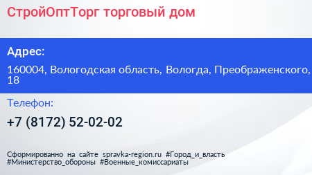 СтройОптТорг, торговый дом по адресу 160004, Вологодская область, Вологда, Преображенского, 18 в дальнейшем Организация, размещена в следующих категориях: