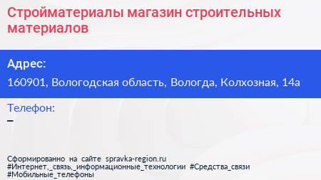 Стройматериалы, магазин строительных материалов по адресу 160901, Вологодская область, Вологда, Колхозная, 14а в дальнейшем Организация, размещена в следующих категориях: