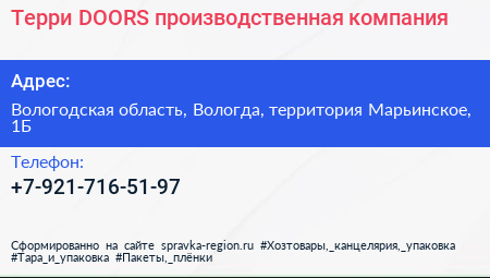 Терри DOORS, производственная компания по адресу Вологодская область, Вологда, территория Марьинское, 1Б в дальнейшем Организация, размещена в следующих категориях: