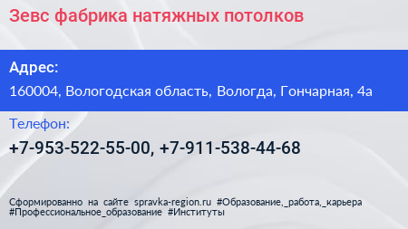Зевс, фабрика натяжных потолков по адресу 160004, Вологодская область, Вологда, Гончарная, 4а в дальнейшем Организация, размещена в следующих категориях: