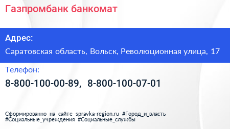 Газпромбанк, банкомат по адресу Саратовская область, Вольск, Революционная улица, 17 в дальнейшем Организация, размещена в следующих категориях: