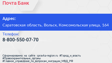 Почта Банк по адресу Саратовская область, Вольск, Комсомольская улица, 164 в дальнейшем Организация, размещена в следующих категориях: