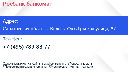 Росбанк, банкомат по адресу Саратовская область, Вольск, Октябрьская улица, 97 в дальнейшем Организация, размещена в следующих категориях: