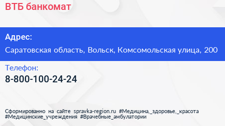 ВТБ, банкомат по адресу Саратовская область, Вольск, Комсомольская улица, 200 в дальнейшем Организация, размещена в следующих категориях: