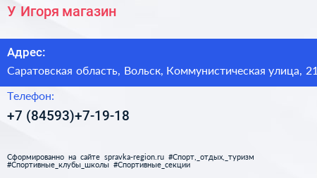 У Игоря, магазин по адресу Саратовская область, Вольск, Коммунистическая улица, 21 в дальнейшем Организация, размещена в следующих категориях: