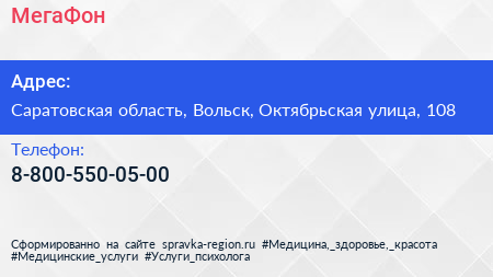 МегаФон по адресу Саратовская область, Вольск, Октябрьская улица, 108 в дальнейшем Организация, размещена в следующих категориях: