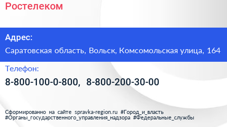 Ростелеком по адресу Саратовская область, Вольск, Комсомольская улица, 164 в дальнейшем Организация, размещена в следующих категориях: