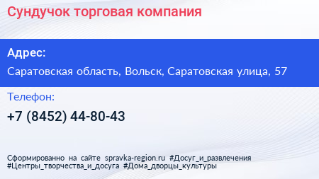 Сундучок, торговая компания по адресу Саратовская область, Вольск, Саратовская улица, 57 в дальнейшем Организация, размещена в следующих категориях: