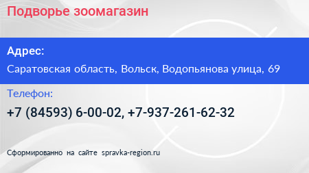 Подворье, зоомагазин по адресу Саратовская область, Вольск, Водопьянова улица, 69 в дальнейшем Организация, размещена в следующих категориях: