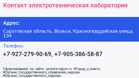 Контакт, электротехническая лаборатория по адресу Саратовская область, Вольск, Красногвардейская улица, 134 в дальнейшем Организация, размещена в следующих категориях: