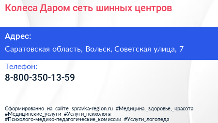 Колеса Даром, сеть шинных центров по адресу Саратовская область, Вольск, Советская улица, 7 в дальнейшем Организация, размещена в следующих категориях:
