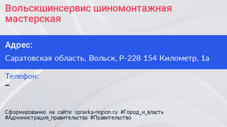 Вольскшинсервис, шиномонтажная мастерская по адресу Саратовская область, Вольск, Р-228 154 Километр, 1а в дальнейшем Организация, размещена в следующих категориях: