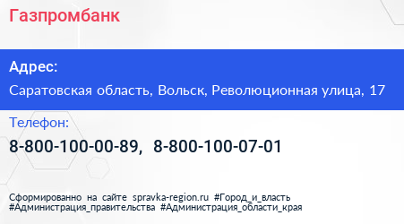Газпромбанк по адресу Саратовская область, Вольск, Революционная улица, 17 в дальнейшем Организация, размещена в следующих категориях: