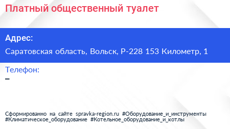 Платный общественный туалет по адресу Саратовская область, Вольск, Р-228 153 Километр, 1 в дальнейшем Организация, размещена в следующих категориях: