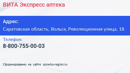 ВИТА Экспресс, аптека по адресу Саратовская область, Вольск, Революционная улица, 18 в дальнейшем Организация, размещена в следующих категориях: