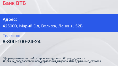 Банк ВТБ по адресу 425000, Марий Эл, Волжск, Ленина, 52Б в дальнейшем Организация, размещена в следующих категориях: