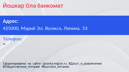 Йошкар-Ола, банкомат по адресу 425000, Марий Эл, Волжск, Ленина, 53 в дальнейшем Организация, размещена в следующих категориях: