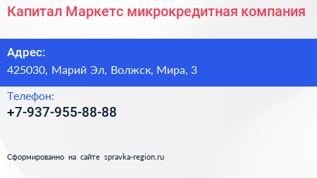 Капитал-Маркетс, микрокредитная компания по адресу 425030, Марий Эл, Волжск, Мира, 3 в дальнейшем Организация, размещена в следующих категориях: