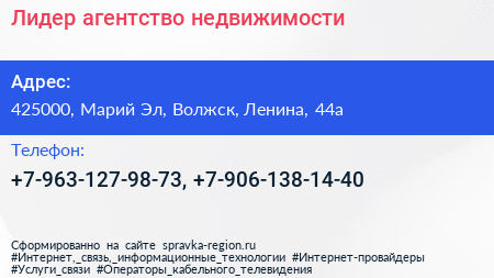 Лидер, агентство недвижимости по адресу 425000, Марий Эл, Волжск, Ленина, 44а в дальнейшем Организация, размещена в следующих категориях: