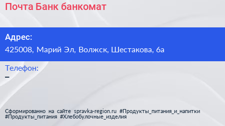 Почта Банк, банкомат по адресу 425008, Марий Эл, Волжск, Шестакова, 6а в дальнейшем Организация, размещена в следующих категориях: