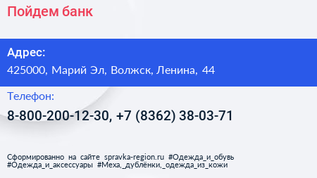 Пойдем!, банк по адресу 425000, Марий Эл, Волжск, Ленина, 44 в дальнейшем Организация, размещена в следующих категориях: