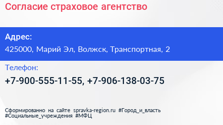 Согласие, страховое агентство по адресу 425000, Марий Эл, Волжск, Транспортная, 2 в дальнейшем Организация, размещена в следующих категориях: