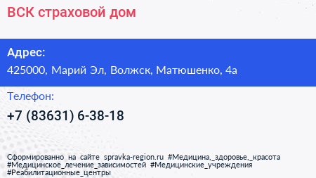 ВСК, страховой дом по адресу 425000, Марий Эл, Волжск, Матюшенко, 4а в дальнейшем Организация, размещена в следующих категориях:
