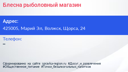 Блесна, рыболовный магазин по адресу 425005, Марий Эл, Волжск, Щорса, 24 в дальнейшем Организация, размещена в следующих категориях: