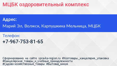 МЦБК, оздоровительный комплекс по адресу Марий Эл, Волжск, Карпушкина Мельница, МЦБК в дальнейшем Организация, размещена в следующих категориях: