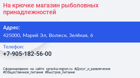 На крючке, магазин рыболовных принадлежностей по адресу 425000, Марий Эл, Волжск, Зелёная, 6 в дальнейшем Организация, размещена в следующих категориях: