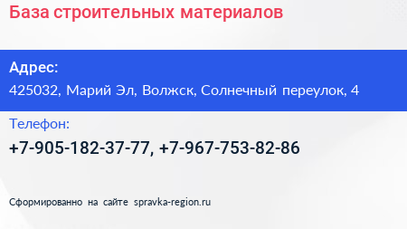 База строительных материалов по адресу 425032, Марий Эл, Волжск, Солнечный переулок, 4 в дальнейшем Организация, размещена в следующих категориях: