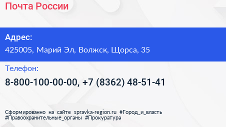 Почта России по адресу 425005, Марий Эл, Волжск, Щорса, 35 в дальнейшем Организация, размещена в следующих категориях: