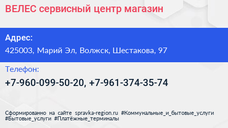 ВЕЛЕС, сервисный центр-магазин по адресу 425003, Марий Эл, Волжск, Шестакова, 97 в дальнейшем Организация, размещена в следующих категориях: