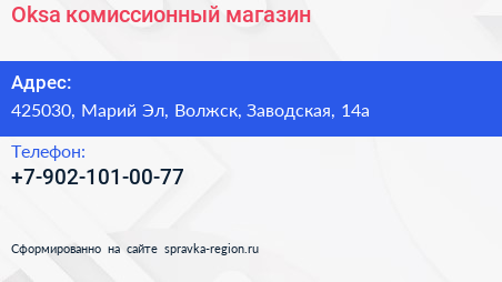Oksa, комиссионный магазин по адресу 425030, Марий Эл, Волжск, Заводская, 14а в дальнейшем Организация, размещена в следующих категориях: