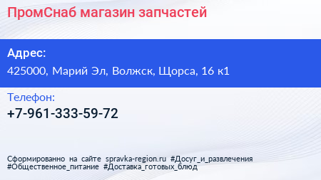 ПромСнаб, магазин запчастей по адресу 425000, Марий Эл, Волжск, Щорса, 16 к1 в дальнейшем Организация, размещена в следующих категориях: