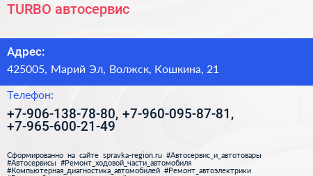 TURBO, автосервис по адресу 425005, Марий Эл, Волжск, Кошкина, 21 в дальнейшем Организация, размещена в следующих категориях: