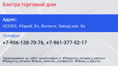 Бактра, торговый дом по адресу 425001, Марий Эл, Волжск, Заводская, 8а в дальнейшем Организация, размещена в следующих категориях: