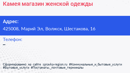 Камея, магазин женской одежды по адресу 425008, Марий Эл, Волжск, Шестакова, 16 в дальнейшем Организация, размещена в следующих категориях: