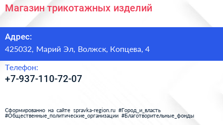 Магазин трикотажных изделий по адресу 425032, Марий Эл, Волжск, Копцева, 4 в дальнейшем Организация, размещена в следующих категориях:
