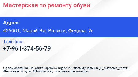 Мастерская по ремонту обуви по адресу 425001, Марий Эл, Волжск, Федина, 2г в дальнейшем Организация, размещена в следующих категориях: