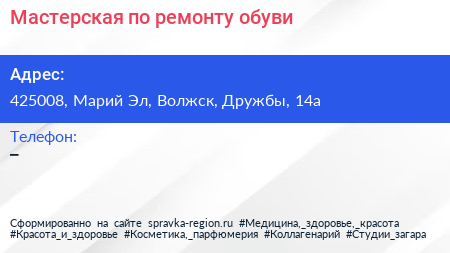 Мастерская по ремонту обуви по адресу 425008, Марий Эл, Волжск, Дружбы, 14а в дальнейшем Организация, размещена в следующих категориях: