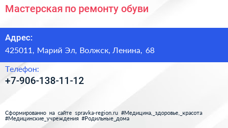 Мастерская по ремонту обуви по адресу 425011, Марий Эл, Волжск, Ленина, 68 в дальнейшем Организация, размещена в следующих категориях: