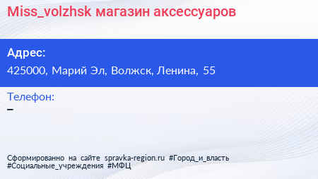 Miss_volzhsk, магазин аксессуаров по адресу 425000, Марий Эл, Волжск, Ленина, 55 в дальнейшем Организация, размещена в следующих категориях: