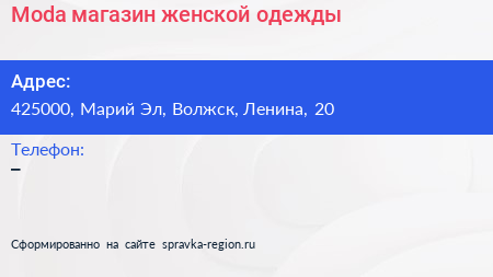 Moda, магазин женской одежды по адресу 425000, Марий Эл, Волжск, Ленина, 20 в дальнейшем Организация, размещена в следующих категориях: