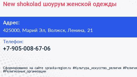 New shokolad, шоурум женской одежды по адресу 425000, Марий Эл, Волжск, Ленина, 21 в дальнейшем Организация, размещена в следующих категориях: