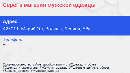 СереГа, магазин мужской одежды по адресу 425011, Марий Эл, Волжск, Ленина, 59а в дальнейшем Организация, размещена в следующих категориях: